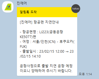 14일 진에어에서 카톡으로 비행이 2시간 출발이 미뤄졌다고 알람이 왔다.